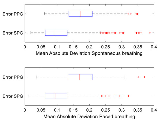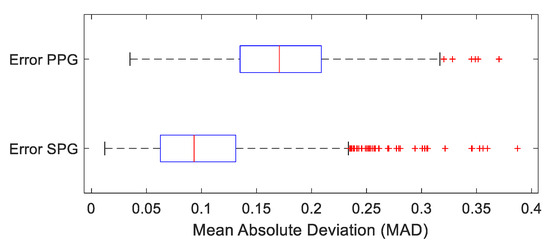 We performed a paired t-test (t-test2 on Matlab, version R2022a) to test the null hypothesis that the MAD values from PPG and SPG are from populations with equal means. The t-test showed that the difference in the mean between SPG and PPG MAD is significant (p < 0.0001), rejecting the null hypothesis at the alpha significance level.