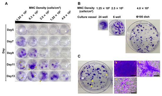 Timing of densification, distribution, and morphology of mesenchymal stem cell (MSC) colonies varied with different seeding densities of mononuclear cells (MNCs). (A) MNCs were cultured at various seeding densities (4.0 × 104, 1.25 × 105, 2.5 × 105, 6.3 × 105, and 1.25 × 106 cells/cm2). MSC colonies were stained with crystal violet over time. Arrowheads indicate aggregated cells. (B) A fixed number of MNCs was seeded into culture vessels of different culture areas (24-well plate, 6-well plate, 100 mm dish), and cultured. Colonies were stained with crystal violet. (C) The pattern of colonies formed under the low MNC seeding density condition (4.0 × 104 cells/cm2). The scale bar indicates 500 µm. (a) Higher density colony, (b) medium density colony, and (c) lower density colony are shown.