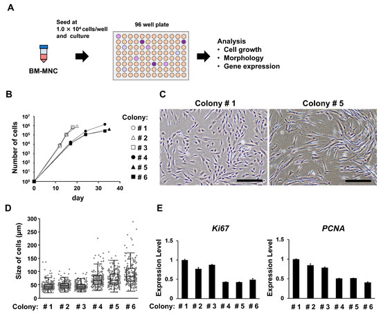 Evaluation of the relationship between the timing of colony formation and the characteristics of mesenchymal stem cells (MSCs) after passaging. (A) Schematic of the single cell cloning assay. Mononuclear cells (MNCs) were seeded at 1 × 104 cells/well to form one colony per well, then passaged. MSCs cultured from each colony were characterized. (B) The number of cells harvested. (C) Phase-contrast microscope images of cells isolated from colonies formed earlier (colony#1) and later (colony#5). Scale bar indicates 300 µm. (D) Boxplot shows cell size data obtained using the microscopic images. (E) Data from real-time PCR analysis of Ki67 and PCNA in Passage 3 cells. The error bars indicate S.E. (n = 3).