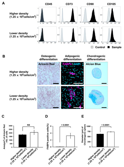 Comparison of surface antigens and differentiation potential of mesenchymal stem cells (MSCs) isolated at higher (1.25 × 106 cells/cm2) and lower (1.25 × 105 cells/cm2) seeding densities of mononuclear cells (MNCs). (A) Data for CD45, CD73, CD90, and CD105 surface antigens using fluorescence-activated cell sorting (FACS) analysis of cells (passage 2). (B) Images of induced differentiation of cells into osteocytes, adipocytes, and chondrocytes. The scale bar indicates 200 µm. (C) Alizarin-red-stained area of cells induced to differentiate into osteocytes for 21 d. The error bars indicate S.E. (n = 5). (D) Percentage of fatty-acid-binding protein (FABP)-positive cells induced to differentiate into adipocytes for 21 d. The error bars indicate S.E. (n = 15). (E) Size of spheres induced to differentiate into chondrocytes for 21 d. The error bars indicate S.E. (n = 6). p-values were calculated using a Student’s t-test. NS indicates not significant.