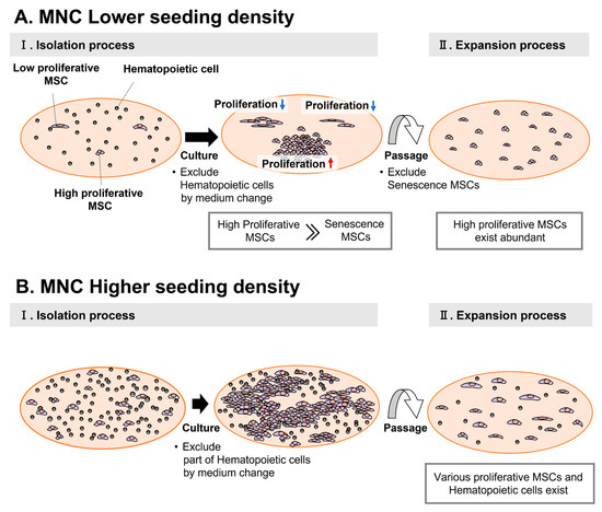 To accomplish this, we focused on the isolation of MSCs. Previous reports state that MSC yield can be increased by optimizing the seeding density of mononuclear cells (MNCs) [17,18,19]. However, the mechanism by which this effect occurs has not yet been elucidated, and no explanation exists regarding its relationship with cell quality. This makes it difficult to determine the important parameters of the MSC manufacturing process.