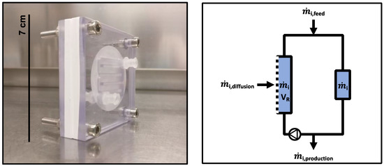 (left) Image of the membrane unit. The inlet and outlet of the channel were connected to vessels or tubes to allow the circulation of cells. Two polycarbonate elements were used to clamp a semi-permeable membrane that was aligned and fixed. (right) Mass balance of a compartment with inflow (feed), outflow (harvest), and diffusion flows in the membrane unit. The mixing pump allowed the circulation of the cultivation broth within the compartment.