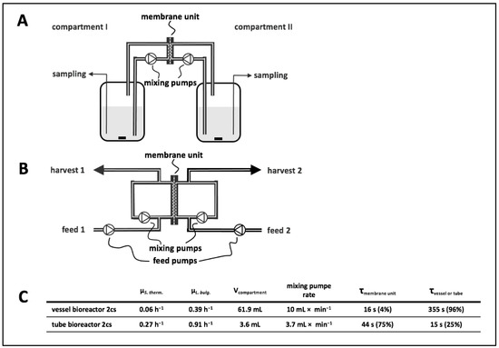 (A) Diagram of a vessel bioreactor system. The vessels were connected to the membrane unit, and circulation of medium in each compartment was achieved by mixing pumps. (B) Diagram of a tube bioreactor system. The inlets and outlets of the membrane unit were connected by tubes, and circulation of medium in each compartment was achieved by mixing pumps. Additionally, attached tubes for feeds and harvests allowed sampling and continuous cultivation by using feed pumps for each compartment. (C) Technical parameters and results of co-cultivations in respective two-compartment systems (2cs) with Lactobacillus delbrueckii subs. bulgaricus in synthetic medium (SM) containing casein and lactose and Streptococcus thermophilus in SM containing lactose. Strains were cultivated in co-culture in the 2cs, enabling exchange of metabolites, and strain-specific growth rates were determined from biomass measurements (Figures S4 and S5 in Supplementary Materials). V, volume.