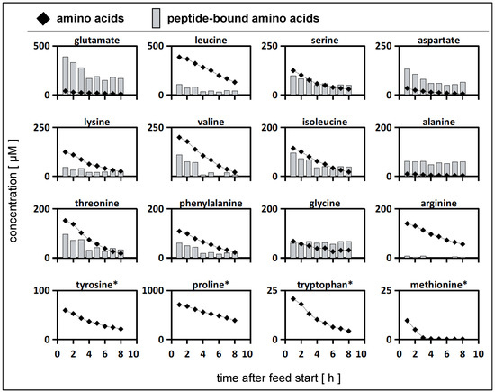 Amino acid profiles in the compartment containing Streptococcus thermophilus during co-cultivation with Lactobacillus delbrueckii subs. bulgaricus in the tube bioreactor system. (rhomb) Extracellular amino acid concentrations (µM) in the compartment containing S. thermophilus during the continuous mode. (bars) Extracellular peptide-bound amino acid concentrations (µM) in the compartment containing S. thermophilus during the continuous mode. S. thermophilus was cultivated in co-culture with L. bulgaricus in the tube bioreactor system containing synthetic medium (SM) with casein and glucose in the L. bulgaricus compartment and SM with glucose in the S. thermophilus compartment. * Profile data for these peptide-bound amino acids not measured.