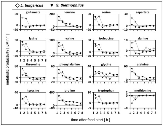 Generally, the mutual release of almost all amino acids in an L. bulgaricus–S. thermophilus co-culture specified, for the first time, that both strains contribute to increasing amino acid concentrations in the medium and the enhanced current understanding of their metabolic activity. L. bulgaricus provided not only peptides but also—equally to S. thermophilus—amino acids to the co-culture, especially at the beginning of cultivation. At the end of the cultivation period, amino acid consumption occurred, indicating a switch between amino acid release and consumption.