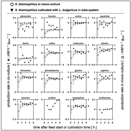 Both strains released and consumed amino acids when cultivated in a tube bioreactor system in continuous mode (Figure 4). During the first 3 h, both strains mainly released amino acids. Subsequently, amino acids were released and consumed. Only methionine was entirely consumed during the continuous mode. These findings quantified, for the first time, to our knowledge, the amino acid production and consumption rates in an interacting co-culture of L. bulgaricus and S. thermophilus and highlighted their dynamics. Consequently, the amino acid transport demonstrated for both strains and their impact on proton gradient and energy metabolism must be taken into account to fully understand the cellular physiology in the co-culture [73]. The production and consumption of amino acids by both strains fulfilled the requirements for bidirectional amino acid exchange between the strains and allowed the manipulation of the co-culture by amino acid additions, such as methionine [67]. The amino acid consumption and production rates for S. thermophilus during co-cultivation with L. bulgaricus in the tube bioreactor system were compared with those of previously published data [62] for S. thermophilus during mono-culture growth (Figure 5). Basically, S. thermophilus released amino acids in co-culture to some extent (Figure 5), although these amino acids were available (Figure 3), indicating the uptake of peptides or amino acid synthesis (except glutamate, aspartate, and methionine). In contrast, S. thermophilus grown under mono-culture conditions only consumed amino acids (Figure 5). The dataset of this study confirmed the previously published simulated metabolic activities [67] of different S. thermophilus strains grown on various amino acid sources. The predicted amino acid fluxes were mostly within the same ranges as those presented in Figure 5. The measurements revealed the dynamics in the amino acid production and consumption of S. thermophilus, indicating the importance of extending the model when used for co-culture simulations [68,69,74].