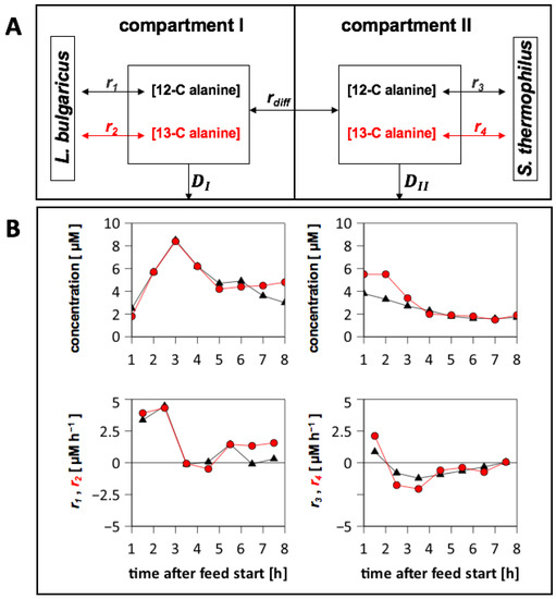 The following supporting information can be downloaded at: https://www.mdpi.com/article/10.3390/bioengineering10010103/s1, Figure S1: Alanine concentrations measured to determine the transport coefficient; Figure S2: Amino acid transport coefficients k; Figure S3: Cultivation of Streptococcus thermophilus containing synthetic medium with casein and lactose in a crimp-top serum bottle; Figure S4: Growth of Lactobacillus delbrueckii subs. Bulgaricus (A) and Streptococcus thermophilus (B) in the vessel bioreactor system; Figure S5: Growth rate of Lactobacillus delbrueckii subs. Bulgaricus (A) and Streptococcus thermophilus (B) in the tube bioreactor system; Figure S6: Cell events of a co-culture grown in a crimp-top serum bottle; Figure S7: Biomass and growth rate of Streptococcus thermophilus in the tube bioreactor system; Figure S8: Glucose and lactate concentrations in the compartment containing Streptococcus thermophilus; Figure S9: Fractions of alanine isotopologues; Figure S10: Diffusion rate of 13-C alanine across the membrane in the tube bioreactor system; Figure S11: r-values at the outlet of the membrane unit; Figure S12: Amino acid composition of casein; Table S1: Composition of the synthetic medium; Table S2: Amino acid concentrations to determine the transport coefficient (k); Table S3: Amino acid concentrations in the Streptococcus thermophilus compartment and the Lactobacillus delbrueckii subs. bulgaricus compartment cultivated in the tube bioreactor system; Code S1: Determination of the amino acid transport coefficient by the least-square estimate in MATLAB ®.