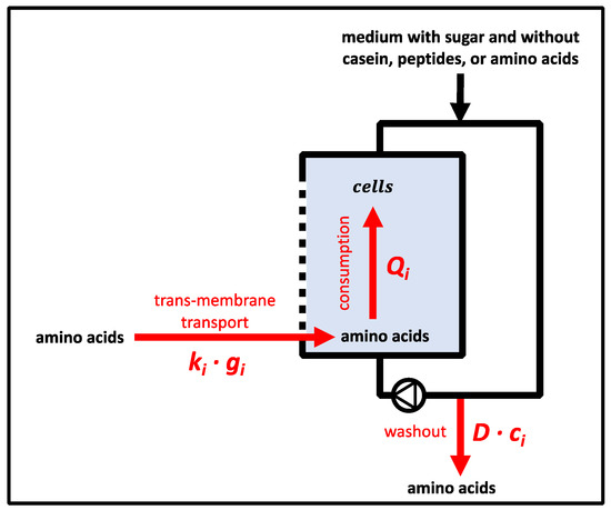 Cultivation studies revealed a growth rate of µ = 0.39 h−1 for L. bulgaricus and µ = 0.06 h−1 for S. thermophilus (Figure S4 in Supplementary Materials). This observation is the first evidence that amino acids and peptides are released from L. bulgaricus and that they diffuse into compartments containing S. thermophilus. However, the growth of S. thermophilus is nutrient-limited.