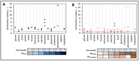 The Damkoehler number (Da) is a dimensionless mass balance that was adapted to indicate whether amino acid consumption in a compartment encountered limitations due to low amino acid supply by membrane transport [64]. DaI (dimensionless) was calculated for each amino acid I in a compartment between two subsequent data points (t1 and t2) when amino acid consumption and transport in the membrane unit into the compartment were present. A homogeneous distribution of amino acids in the compartment was assumed. Da considered amino acid decrease by consumption (Qi) and washout by dilution (D). An increase in amino acid concentration in a compartment was expected from transport across the membrane (see Section 3.6.6.). Da depicts the quotient between Qi, D for washout, and the transport rate in the membrane unit for an amino acid i as follows:
