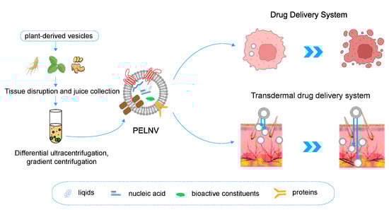 In the past few decades, extracellular vehicles (EVs) in plant cells (which have rigid walls) have attracted little attention compared to EVs in mammalian cells. However, in recent decades, increasing evidence indicates that plant cells also secrete EVs that play a key role in plant growth, development, and functioning, which have attracted researchers’ attention. Plant exosome-like nanoparticles (PELNVs) are biotechnology products with great potential for development. They have the advantages of easy extraction, high stability, good tissue penetration, and low immunogenicity [], which make them have great clinical applications in DDSs and TDDSs. As potential excellent vehicles in TDDSs, PELNVs not only have active constituents in a parent-of-origin plan but can also be used to deliver exogenous substances, such as mRNA, miRNA, mitochondrial DNA, and proteins, which are far better than synthetic nanoparticles and mammal EVs. As we know, synthetic nanoparticles only serve the purpose of delivering drug molecules and do not contain any innate therapeutic capabilities.