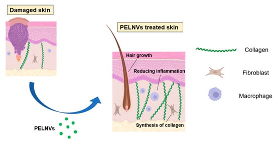 Plants have a long history of use in the treatment of skin cancer and skin disorders. PELNVs are secreted nanovesicle messengers responsible for intercellular communications and show promise as a new biotechnological skin care agent. PELNVs are naturally generated and carry innocuous components from their parent cells, some of which have been proven to be therapeutic. For instance, nanoparticle compositions containing EVs from ginseng, pine leaves, salvia, and other plant sources have been reported in the literature to show hair regrowth-promoting effects by deeply penetrating the skin and providing nutrients, stimulating hair follicles and exerting antioxidant activity on the scalp [].