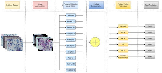 The methodology followed in this paper consists of six steps. Step one: collect the cytology dataset that consists of 1000 samples for 4 different cervical cancer classes. Step two: perform image augmentation. Step three: extract features using CNN from ten deep learning structures (4 features for each DL structure total of 40 features). Step four: concatenate all the features from the ten DL structures to be fed into the feature fusion step. Step five: apply different feature fusion techniques to fuse or select features. Step six: feed the features into an SVM to measure classification performance. The details of each step are described in detail in the following section. Cytology dataset acquisition and augmentation are described in Section 3.1 and Section 3.2. Extracting features using deep learning structures are described in Section 3.3. The theoretical background of the six selected fusion techniques is described in Section 3.4 and Section 3.5. Finally, the SVM method is described in Section 3.6.