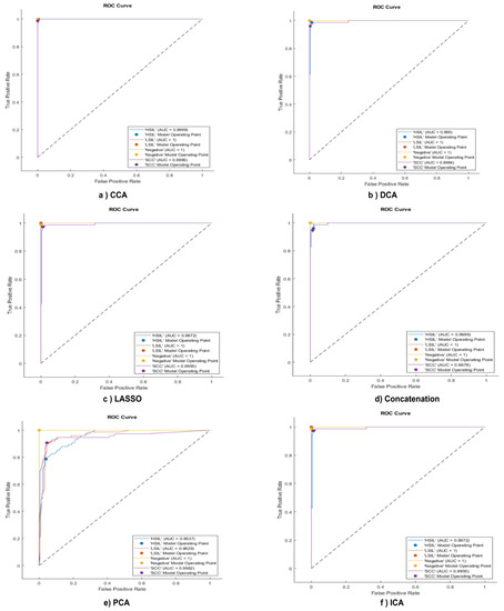 Six receiver operating characteristic curves of the SVM model when considering six feature fusion techniques. (a) Using CCA, (b) DCA, (c) LASSO, (d) concatenation, (e) PCA, and (f) ICA. The figure shows the performance of the SVM via AUC after using different fusion techniques.