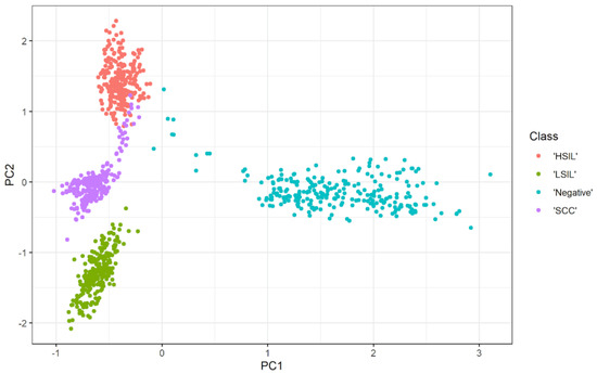 Figure 6 shows the relationship between two principal components. The scatter representation visually shows how these two principals are capable of discriminating between classes. The clustering describes the classification capability of these two PCAs, where the red cluster indicates HSIL, the dark green cluster indicates normal, the cyan color represents LSIL, and the purple grouping distinguishes the SCC. The three significant features are exploited to train polynomial SVM. The corresponding confusion matrix in Figure 2e shows the performance of the classifier using the three independent features. The capability of the SVM to discriminate HSIL is low in terms of sensitivity and precision. On the other hand, recall and precision are low for LSIL. The normal class is the best distinguished, with a sensitivity and PPV of 100%. The precision of the SCC class is lower, at 87.2%, whereas the sensitivity is a moderate value that does not exceed 90%. The overall accuracy of the designed SVM using the most significant features is 90%, and the misclassification rate reaches 10%, which is too high. Moreover, Figure 3e illustrates the AUC for each class, which is the lowest in the SCC class with 0.95, and the highest in the normal class where the AUC is one.