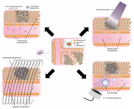The use of nanoparticles and energy to maximize the therapeutic index. In the tumor microenvironment, the integrity of the blood vessel wall lining is undermined due to uncontrolled vasculature growth, allowing increased accumulation of molecules. The use of nanoformulations to prolong the half-life and to exploit such enhanced permeability and retention (EPR) effect is central in the field of nanomedicine. pH: The tumor microenvironment is slightly more acidic (pH 5.5~6.5) than normal tissues, allowing the selective release of therapeutic cargos from the nanoparticle carriers. NIR Light: The use of near-infrared light (>800 nm) to excite nanoparticles for imaging and photodynamic/photothermal therapies. Magnetic Field: Magnetic fields are applied to the tumor to guide superparamagnetic nanoparticles toward the region of interest, as well as for magnetic resonance imaging. Ultrasound: The combination of focused ultrasound and microbubbles can assist in nanoparticle delivery and tumor ablation (HIFU thermal ablation and sonosensitization).