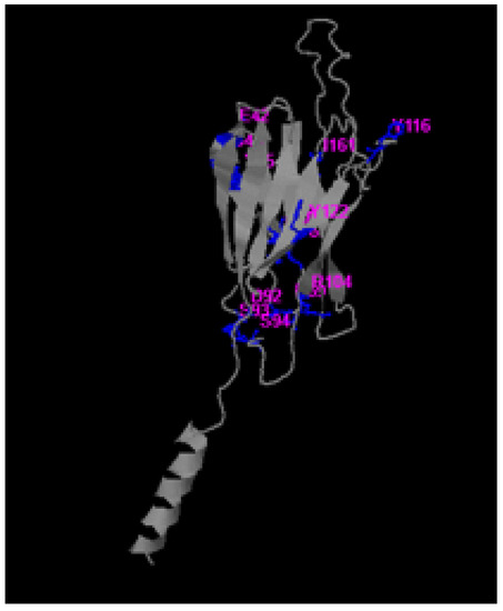 The targeted protein of the monkeypox virus addressed in this study is MPXVgp169 with accession number UTG40865.1, which was retrieved from the NCBI (National Centre for Biotechnology Information). The primary structure of the protein was converted into the tertiary structure by the utilization of the trRosetta (https://yanglab.nankai.edu.cn/trRosetta/, accessed on 17 October 2022). The tertiary structure of the selected protein was visualized by the Discovery Studio Visualizer [12].