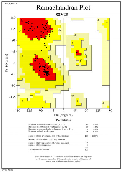 The predicted tertiary structure was validated for structural quality by PROCHECK (https://saves.mbi.ucla.edu, accessed on 18 October 2022) and the Ramachandran Plot was constructed. The ERRAT server was utilized for the estimation of structural quality score of the constructed protein. Therefore, the structural quality was assessed by the presence of Rama-favored regions in the computed RC plot by PROCHECK. The predicted tertiary structure was submitted as input to the PROCHECK server.