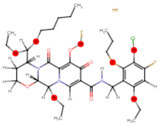 Chain engineered structure of dolutegravir; red points are representing the sites of addition of chains or atoms; brown color shows the added atom of fluorine and chlorine is presented by green color.