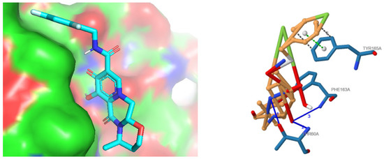 Molecular docking was performed between chain-optimized active compound and the targeted virulent protein MPXVgp169 using Autodock Vina 1. The docked model which was selected on the basis of the lowest binding energy retained the binding energy of −9.4 kcal/mol, predicting the more efficient binding with the protein as compared to non-chain engineered active compound whose affinity was −7.4 Kcal/mol. The docked complex of chain-engineered dolutegravir and MPXVgp169 virulent protein is presented in Figure 5.