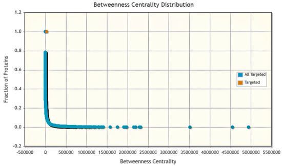 Phage–Host Interaction search tool (PHIST) predicted the host of viruses on the basis of exact matches between viral and host genomes. It improved the accuracy of host prediction at the species level. Various interactions between humans and monkey pox were depicted such as cellular interaction of anthrax toxin, cytokine signaling in immune system, IL12 signaling mediated by STAT4, IL12-mediated signaling events, IL23-mediated signaling events, and IL27-mediated signaling events with statistics-based P values as organized in Table 2. The betweenness centrality graph showed that most of the proteins were targeted between the interaction of human and monkeypox virus with total fraction of 1 indicating the significant interaction as presented in Figure 7.