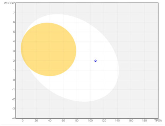 The boiled egg model delivered an intuitive, rapid, easily reproducible yet unprecedented and robust method to analyze the brain access of small molecules and the passive gastrointestinal absorption useful for drug discovery and development. If the molecule is present in the white area of the boiled egg model, it depicts gastrointestinal absorption and if the molecule is present in the yellow area in the boiled egg model, it depicts that molecule has access to the blood–brain barrier. The boiled egg model of the chain-engineered dolutegravir showed that this drug will be absorbed in the gastrointestinal tract with efficiency, as presented in Figure 9.