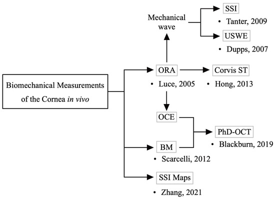 Development of in vivo corneal biomechanical measurements. Initial techniques for assessing the corneal mechanical characteristics utilized air puffs (e.g., ocular response analyzer (ORA)) [14]. Later, less destructive corneal deformation techniques, such as ultrasound (mechanical waves) [16,17], were developed. In recent years, new technologies such as brillouin microscopy (BM) [18] have emerged. Some commercial devices (ORA, corneal visualization Scheimpflug technology (Corvis ST)) are now used in clinical settings.