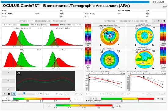Corvis ST reports two parameters, namely, the corneal biomechanical index (CBI) and the total biomechanical index (TBI). Both are new parameters based on a linear regression analysis combining corneal morphology and stiffness parameters, which can improve the detection rate of conical corneas [36]. Other parameters based on Corvis ST that are able to characterize the corneal biomechanical features in vivo have recently been proposed [37]. Figure 2 shows an example of keratoconus identified using Corvis ST (Oculus Inc., Wetzlar, Germany), and multiple parameters are quantified.