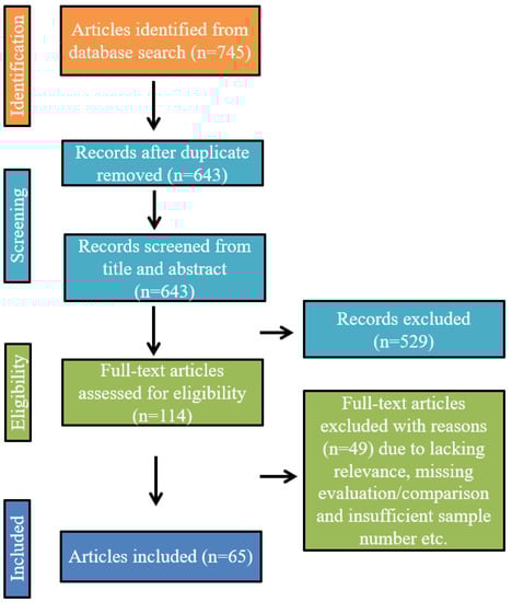 To incorporate a thorough review, the search procedure was implemented using machine learning and deep learning with features from biomedical signals to generate a model for measuring cuffless noninvasive BP. For this purpose, google scholar and PubMed were used with a timeline from 2010 to 2022. The following general search term was used from both database: (“ECG” or “electrocardiogram,” “ECG” or “EKG” or “PPG” or “photoplethysmography” or “biomedical signal,” “vital signs” or “physiological signals” or) and (“cuffless blood pressure” or “noninvasive blood pressure” or “hypertension” or “blood pressure” or “arterial pressure” or “hypotension” or “BP”) or (“machine learning” or “deep learning” or “artificial intelligence” or “neural network” or “convolutional neural network” or “ANN” or “CNN” or “long short term memory” or “LSTM” or “RNN” or “recurrent neural network”) or (“pulse transit time” or “pulse wave velocity”). It is essential to point out that using those keywords, many articles were found that were not related to this literature survey, and those were sorted out at the initial stage. Figure 1 depicts the selection process, divided into four stages (identification, screening, eligibility, and included). Overall, 745 articles were retrieved from the search using google scholar and PubMed. After removing the duplicate ones, the number of articles remaining was 643. Those articles were screened for title and abstract, and 529 were removed for not being relevant to this study or out of scope. The remaining 114 full-text articles were checked thoroughly, and 49 more were removed due to different reasons such as missing evaluation or comparison, insufficient dataset or sample number, lack of rationale behind decisions, insufficient explanation of experiment or method, etc. Finally, 65 articles were found relevant to this literature review and fulfilled the criteria in the eligibility section of the framework.