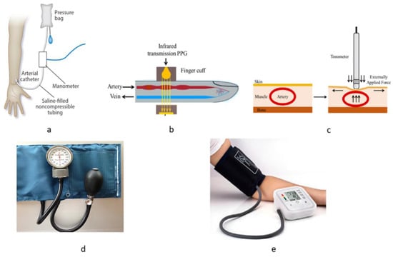 Traditional methods of BP measurement techniques. (a) arterial catheterization method, (b) vascular unloading technique, (c) arterial tonometry method, (d) auscultation method, (e) oscillometric method [,] CC by 4.0.