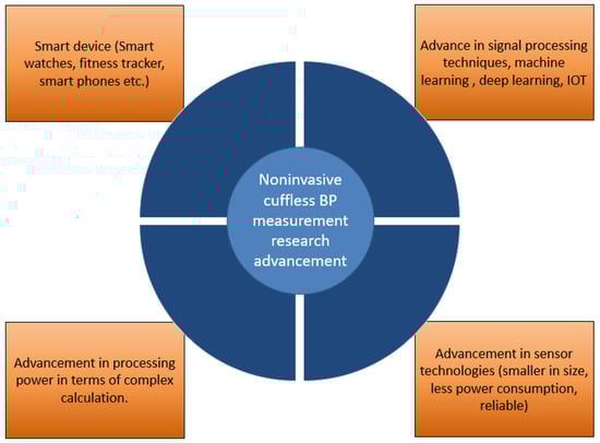 Technological advances behind the research progress in cuffless BP measurement techniques.