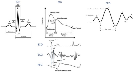 PPG signal provides the amount of oxygen saturation in blood using the calculation from transmitted and receiving light emitted from led in a specific area on the body such as the finger or ear [,]. Since blood pressure in arteries or blood vessels impacts the oxygen saturation or peak information or interval information from consecutive PPG waves, this signal has been extensively used in various research to find BP measurements [,]. When the blood is ejected from the heart, the body goes through changes such as displacement, acceleration, and these measurements can be recorded as ballistocardiogram (BCG) [,,]. Figure 4 shows standard biomedical signals related to BP measurement techniques. Among other biomedical signals using ultrasound measuring absolute blood volume, blood volume oscillations measured by electrical bioimpedance and seismocardiography (SCG) measuring the lower frequency vibrations from the heart are also used in many research studies to make a relation with the change in blood pressure [,,]. Due to the advancement in smartphones concerning a higher capacity for calculation and image processing ability—the smartphone can be used to create a PPG wave, and various information can be generated from that wave as a result [,]. Additionally, recent high-end smartphones have additional sensors to acquire different biomedical signals, such as SCG, PPG, ECG, and BCG, etc., to provide health alerts based on threshold strategies [,]. Like smartphones, smartwatches and fitness trackers are equipped with advanced sensor technologies and analysis capabilities to provide alerts for different health conditions [,,,]. To summarize, the recent technological advancement helped researchers have easy access to biomedical signals and high calculation capabilities in terms of speed and complexity.