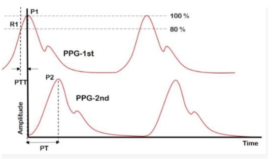 Pulse transit time is defined by the time it takes for a pulse pressure wave to travel from one point of the artery to another, as shown in Figure 5 []. To measure the PTT, the most common method is to place two PPG sensors in two places close to the artery: ear, finger, toes, etc. [,,]. Research has shown that there has been a reciprocal relationship between blood pressure and pulse transit time [,]. On the other hand, a researcher has also proved that only PTT is not sufficient to measure accurate BP levels [,].