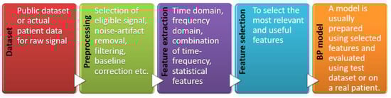 Pulse wave analysis means using the pulse wave through signal processing techniques and extracting necessary features for further use in building a model for BP measurement. A typical step for pulse wave analysis to get a BP measurement model is shown in Figure 6. The process requires one or more sensors to measure PPG waves, signal processing tools for removing noise and artifacts, feature extraction and selection, etc. Many attempts have been made to build a model for BP measurement using pulse wave analysis [,,,]. Examples of features in a typical PPG wave are shown in Figure 7.