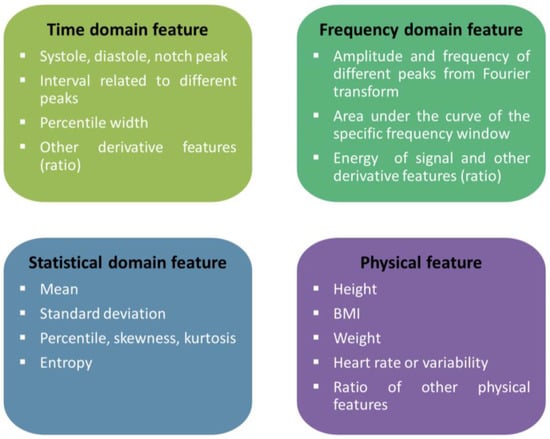 Four main types of features are popular among researchers to extract from pulse waves for cuffless BP measurement: time domain-based, frequency domain-based, time-frequency domain based, and statistically based, as shown in Figure 8. Some researchers opted for single-domain features, while others opted for a combination of several domain features. A typical pulse wave analysis diagram is shown in Figure 6. Processing raw signal for noise or artifact are not in the scope of this literature review; rather, the focus will be the typical features used by the researchers from pulse wave analysis to create a model for BP measurement. As shown in Figure 7, a common strategy is to get the derivatives of the PPG signal to get different peak values and intervals. Additionally, using the Fourier transform, the primary information can be achieved at significant frequencies. Other than the physical features such as age, height, weight, BMI, heart rate, etc., another aspect researchers follow for features are statistical features [,,]. The time domain, frequency domain, statistical domain, and physical features used in the literature survey have been summarized in Figure 8 [,,,,,].