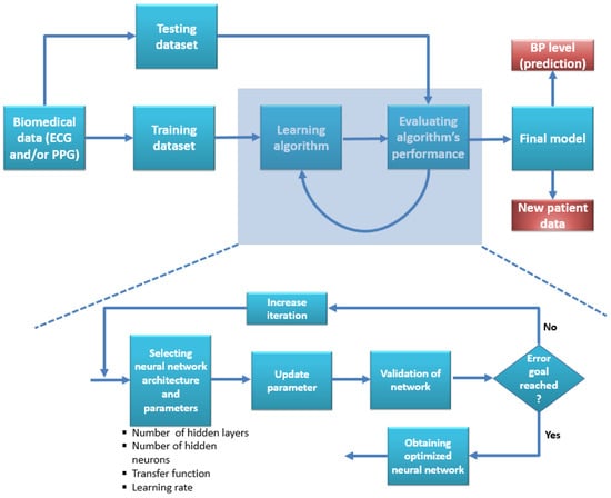 With the advancement of deep learning networks through artificial neural networks (ANN), convolutional neural networks (CNN), recurrent neural networks (RNN), Long and short-term memory (LSTM), etc., they are using different biomedical signals such as ECG and PPG into learning network to achieve a model for BP measurement becoming very popular among scientists. The main reasons are: compared to shallow machine learning algorithms, deep learning algorithms can extract features on their own and can do a better job in most cases by finding features that might have been missed in the case of shallow ML, also although it is computationally extensive the performance achieved from deep learning networks were much better than conventional ML algorithms. For the past few years, scientists have tried every possible deep-learning algorithm for BP waveform prediction, where the model automatically learns critical features. The ECG signal can be acquired using an electrode over a specific part of the upper torso; the PPG signal can be acquired from either ear or fingertip. The gold standard arterial blood pressure can be chosen from the cuff-based method or a radial artery catheter. Figure 9 depicts an example of a deep learning algorithm from start to finish.
