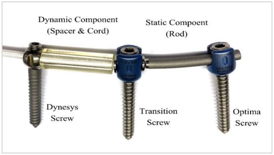 The Dynesys Transition Optima (DTO) device (Zimmer-Biomet Spine, Denver, CO, USA) is a unique pedicle screw/rod-based dynamic stabilization system that combines the well-known Dynesys dynamic stabilization system and the OPTIMA ZS spinal system (Figure 1). This device includes two major components: the dynamic (called Dynesys fixator) and the static (called static fixator or fusion) components. The dynamic component comprises a combined polyethene terephthalate (PET) tension cord (100 mm in length and 4.5 mm in diameter) and a preloaded polycarbonate urethane (PCU) flexible tube spacers with an outer diameter of 11.0 mm and tube thickness of 2.0 mm. The static (fusion) component consists of a titanium rod (6.0 mm in diameter) and a transition screw connecting the fusion and dynamic segments. The DTO system allows for the arthrodesis of critically unstable vertebrae in combination with the dynamic stabilization of adjacent moderately degenerated segments [34].