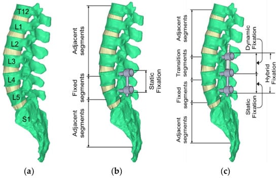 Depiction of spinal segments from T12 to sacrum (sagittal view): (a) intact specimen, (b) static fixation at L4/5 segments, and (c) hybrid fixation at L3–L5.