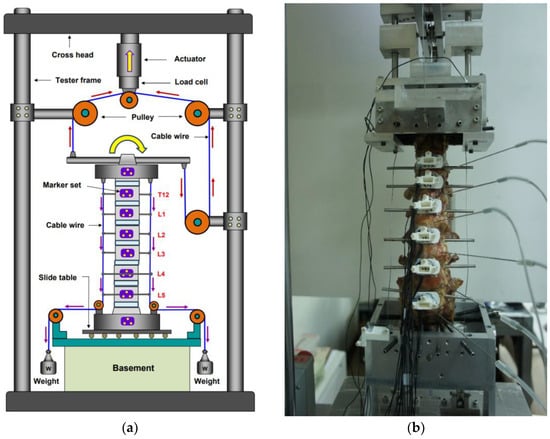 A uniaxial electromechanic testing machine (Instron, Electro Pulse E3000, Norwood, MA, USA) was used to conduct all loading experiments. To produce a moment vector from the uniaxial tester, i.e., the stroke of the actuator of the tester, a cable–pulley mechanism was designed to carry out the pure moment in the test frame. A compressive follower load (FL = 500 N) from T12 to S1 was applied using a system of eyelets, cables, pulleys, and dead weights to simulate the body weight. Each eyelet passed approximately through the center of the vertebral body and was mounted laterally onto the vertebra; then, the load was applied bilaterally by cables and dead weights. Thus, the compressive load path can be applied following the curvature of the lumbar spine. The experimental setups are shown in Figure 3a. Custom-designed aluminum spinal fixtures were made to fix the specimen securely onto the testing machine. To mount the specimen onto the spinal fixture, eight embedded fixation screws were inserted into the cranial (T11) and caudal sacrum vertebra. A Plexiglass marker set containing three active light-emitting diodes was installed at the anterior aspects of each vertebra (T12–L5), these markers can be detected by an optoelectronic motion measurement system and applied to track the segmental motions.