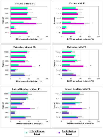 Percentage ROM of the specimens treated with static fixation and hybrid fixation to the intact spine under flexion, extension and lateral bending modes with and without a follower load. (*) Significance between hybrid and static fixations.