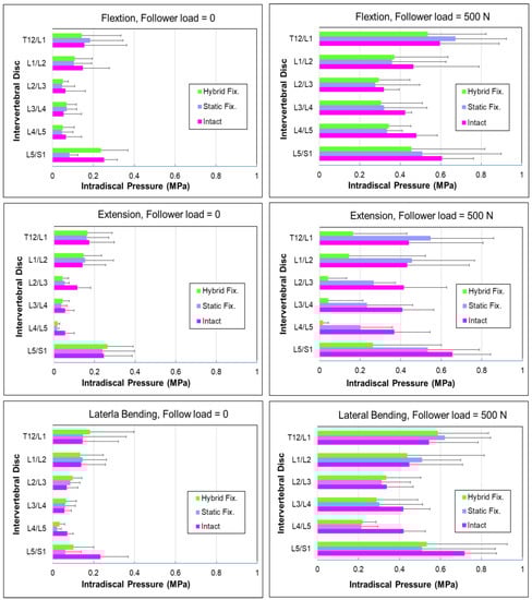 Figure 5 shows the values of IDP for each intervertebral disc (IVD) segment in the lumbar spine. An in vitro biomechanical test was conducted to examine the effect of body weight on IDP at the spinal disc. A 500 N follower load was applied along the vertebral body to simulate the body weight with the pure moment of 7.5 N·m in flexion, extension, and lateral bending motion. It was found that the applied moment did not significantly increase the IDP but the follower load did. In this study, the measured IDP was less than 0.3 MPa during flexion, extension, and lateral bending motion without follower load. We think that the effect of different motion modes on the IDP was relatively minor; however, the IDP was markedly increased with follower loading. It was observed that the maximum IDP was 0.72 MPa at L5/S1 level under lateral bending combined with a 500 N follower load. Results indicated that the use of DTO restored IDP similar to that of the intact spine; thus, the increase in physiology loading could be an important factor for the increment in IDP.