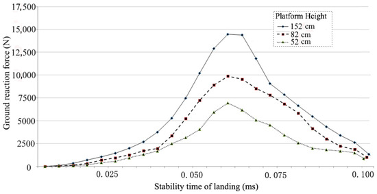 Subjects jumped down from the different height platforms on the force plate. The stable time of subjects landing for each test was evaluated using the sequential estimation method. The balanced condition during foot landing was observed when the standard deviation of the overall average was p < 0.05 [24]. Their landing time had a tendency towards consistency due to the professional nature of the subjects. Each subject performed three jumps from the different platform heights. Means and standard deviations were used for the analysis of dynamic stability. The time of dynamic stability [25] was approximately 87–95 ms (Figure 2). This value is used for the boundary condition of foot finite element (FE).