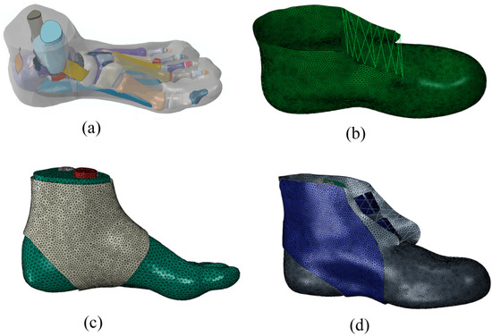 FE model: (a) foot structure; (b) boot; (c) foot and the elastic ankle brace; and (d) foot, boot and the outside ankle brace.