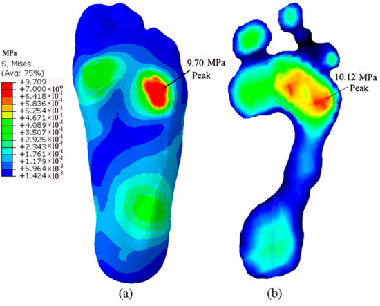 The FE model was validated by the results of F-scan measurements taken while standing on a 20° inclined platform. The peak stress of 9.7 MPa from the prediction concentrated on five metatarsal regions, whereas the value in the F-scan measurement increased to 10.12 MPa, and the pressure regions of peak stress concentrated on the lateral metatarsal region of forefoot (Figure 4). The measured peak pressure was greater than the value predicted through the simulated calculation. This difference may be due to the resolution ratio of the F-scan sensors, which reported an average pressure for an area of approximately 25 mm2.