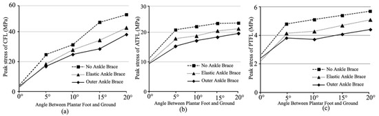 Peak stresses of the lateral ankle ligaments during the foot landing on 0–20° incline: (a) CFL; (b) ATFL; and (c) PTFL under non-, elastic-, and external- ankle-brace conditions.
