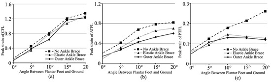 Figure 5 showed peak stresses of lateral ankle ligaments (the calcaneofibular ligament-CFL, the anterior talofibular ligament-ATFL, and the posterior talofibular ligament-PTFL) under different ankle-brace conditions when the foot landed on an inclined platform of 0–20°. Compared with the non-ankle-brace protection, the external-ankle-brace protection decreased the peak stresses of CFL, ATFL, and PTFL by 25.4–32.3% (Figure 5a), 15.2–33.0% (Figure 5b), and 22.4–27.2% (Figure 5c), respectively. The predicted peak stresses of the aforementioned ligaments with the external ankle brace were lower than those with the elastic ankle brace (Figure 5). The peak stress of CFL had an obvious increase (Figure 5a). The increase was approximately 72.4–83.6%. The peak strains of the aforementioned ligaments are shown in Figure 6. Compared with the non-ankle-brace condition, the peak strains of CFL, ATFL, and PTFL decreased by 4.1–21% (Figure 6a), 27.0–37.3% (Figure 6b), and 14.3–53.9% (Figure 6c), respectively, under the external ankle-brace condition, and by 3.5–24.3% (Figure 6a), 14.7–24.1% (Figure 6b), and 18.2–51.0% (Figure 6c), respectively, under the elastic-ankle-brace conditions.