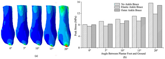 Peak stress and stress distribution of the fibula when the foot landing on 0–20° incline: (a) the stress-distribution tendency; (b) peak stress under non-, elastic-, and external-ankle-brace conditions.