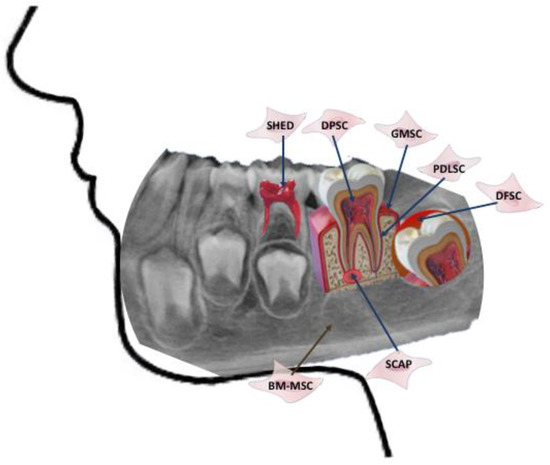 - Gan, L.; Liu, Y.; Cui, D.; Pan, Y.; Zheng, L.; Wan, M. Dental Tissue-Derived Human Mesenchymal Stem Cells and Their Potential in Therapeutic Application. Stem Cells Int. 2020, 2020, 8864572. [Google Scholar] [CrossRef]
