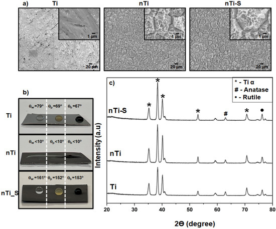 The phase analysis of the different surfaces was assessed using XRD. Studies have shown that surface crystallinity plays a major role in wettability and cellular interaction [41,42]. The rutile and anatase phase of TiO2 was present on all surfaces and these phases have been shown to be more cytocompatible. The results (Figure 1c) indicated that the surfaces have the following metallic alpha-phase titanium intensity peaks at 32° (002), 35° (100), 40° (101), and 53° (102). The TiO2 anatase-phase intensity peaks at 62° (204), and the TiO2 rutile-phase intensity peaks at 27° (110) and 76° (110). The nTi and nTi-S had a higher presence of metallic alpha-phase titanium on the surface because the treatment removed the impurities and the oxide layer on the Ti surface. The surface modification of nTi-S did not alter the crystal structure when compared to the nTi surface.