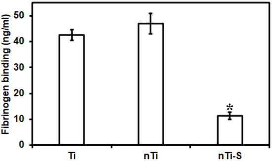 The fibrinogen adsorption from PRP on the different surfaces was quantified using a commercially available enzyme-linked immunoassay (ELISA) for human fibrinogen. The most abundant proteins present in human blood are albumin and fibrinogen. Albumin is a passivating protein; it does not actively promote blood clotting. However, fibrinogen is a key protein in the development of surface-induced thrombosis through binding the integrin receptor αIIbβ3 (GPIIb/IIIa) of platelets. This leads to platelet immobilization, activation, and aggregation, and this is also a precursor for fibrin formation. Fibrin is a leading structural component in the blood clotting coagulation cascade. Various studies have demonstrated that nano, micro, or micro–nano surface topography influences protein adsorption and alters protein conformation and spatial distribution on the surface [17,43]. The sizes of the proteins are in the nanometer range and studies have shown that the surface topography and its feature size can influence protein adsorption and nucleation within the topography [44]. PRP mostly contains blood proteins (fibrinogen), platelets, and white blood cells. The surface-exposed PRP was analyzed to evaluate the protein content in the solution, and the amount of protein adsorbed on the surface was calculated by subtracting the protein content in the positive control. The results (Figure 2) indicate no significant difference in fibrinogen adsorption on the nTi and Ti surfaces. On the contrary, the nTi-S surfaces had significantly lower fibrinogen adsorption compared to the nTi and Ti surface. This is because the lower surface energy nTi-S surface prevents the interaction with liquid, reducing the protein adsorption. In addition, studies have shown that fibrinogen adhered to hydrophobic surfaces has a specific conformation that prevents fibrinogen fiber formation [45].