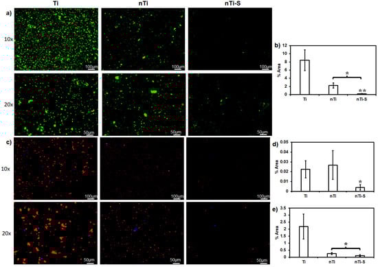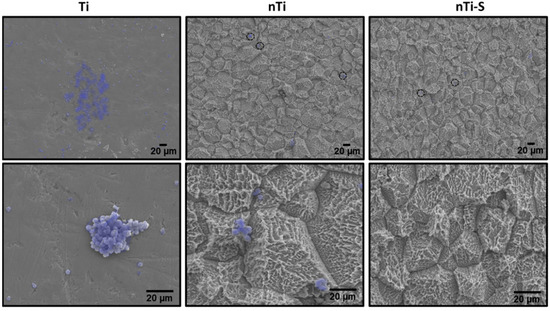 The topography of the different surfaces was imaged using SEM. Surface topography is an important property that determines the biological responses to a foreign material. The thermochemical treatment alters the surface properties such as the topography, chemistry, and wettability without altering the bulk properties of the titanium substrate [40]. The results (Figure 1a) indicated that the Ti surfaces were smooth and did not have any unique surface topography. The nTi surfaces had a microscale topography formed because of quicker etching near the grain boundaries. Faster etching is due to the disordered atomic arrangement at the grain boundaries. Further, etching on the grain surfaces led to the formation of nano-pits. Thus, the results indicate that the thermochemical treatment led to a micro–nano topography. Further, after silane modification, the nTi-S surfaces did not show any significant difference in the surface topography when compared to the nTi surfaces. The presence of silane after deposition was confirmed with the XPS results in the author’s previous publication [38].
